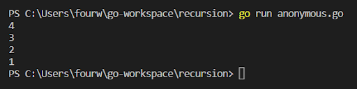Here, I’ll be starting my program by creating a directory in the go -workspace. I’ll name this ‘recursion’. For that, I’ll type in the Command Prompt (or Terminal in the case of macOS or Linux)cd go-workspace